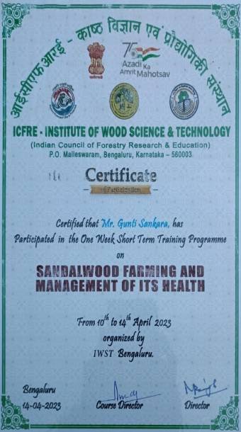 Throughout his career, Mr. Sankara has trained more than 500 farmers across India through various programs, empowering cultivators with advanced techniques and field-based best practices. His deep passion for agroforestry and commitment to excellence have earned him invitations as a Guest Speaker at prominent events in Bangalore and Hyderabad, where he has shared his valuable expertise on sandalwood cultivation and sustainable farming.